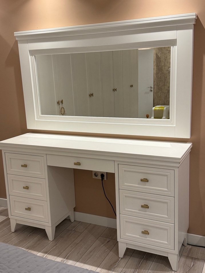 Lake boyalı, beyaz renkli, klasik ve zarif tasarıma sahip makyaj masam satılıktır. Büyük aynası ve geniş çekmeceleri sayesinde oldukça kullanışlıdır. Sağlam yapısı ile uzun yıllar sorunsuz şekilde kullanbilirsiniz. Ayaklı tasarım sayesinde yerle teması yoktur ve temizlik açısından rahatlık sağlar. Ürün genel olarak oldukça temizdir. Üzerinde tütsüden kaynaklı çok hafif bir iz bulunmaktadır, kullanıma engel değildir. Bunun dışında darbe, şişme veya herhangi bir hasar yoktur. Çekmecelerin tamamı sorunsuz şekilde çalışmaktadır. Lake boyalı olduğu için suntalam ürünlerle kıyaslanmamalıdır. Yeni alacak kişiler gönül rahatlığıyla kullanabilir. Ölçüler: Makyaj aynası En: 167 Boy:97 Makyaj masası En:170 Boy: 93(ayaklar dahil) Derinlik:47 Pazarlık payı vardır.