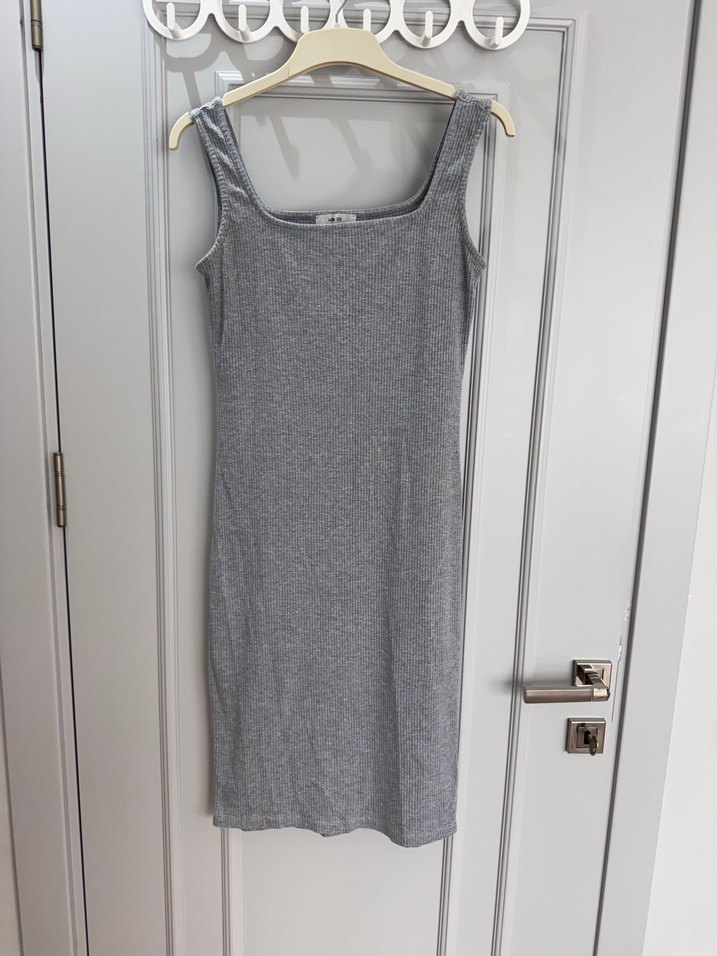 Gri renk, kolsuz ve kare yaka tasarımlı, yumuşak sentetik kumaştan yapılmış, günlük kullanım için midi boy dar kesim elbise.