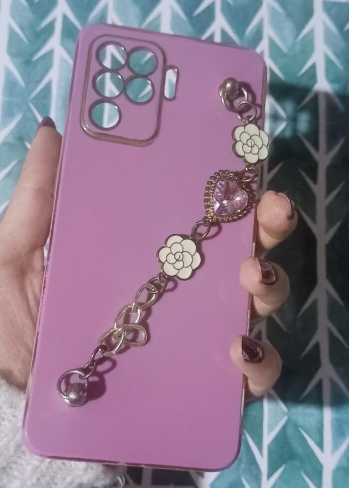 Lila renkli arkasında taşlı ve çiçek süslü telefon kılıfı Model= Oppo reno 5 lite