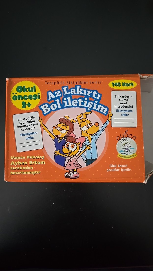 Renkli kağıt kartlardan oluşan, uzman psikolog Ayben Ertem tarafından hazırlanan 145 kartlı okul öncesi çocuklar için iletişim ve duygu ifadesini destekleyen oyun. 2-3 tanesinin köşesinde fotoda ki gibi hafif yıpranma var ama kullanıma engel değil.