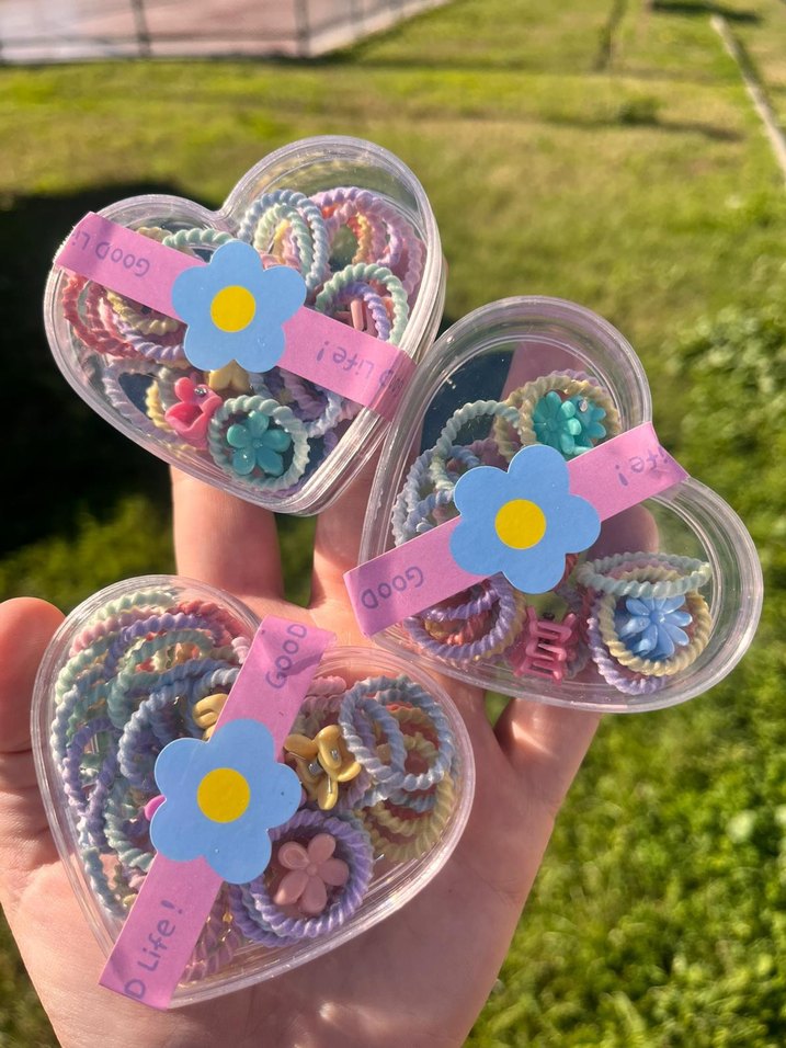 az saçlı bebekler için uygundur. Pastel renklerde, elastik çiçek desenli saç tokaları. Bohem ve retro tarzda, kalp şeklinde şeffaf kutularda sunulur.
