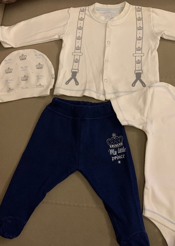 Aziz Bebe marka, 0-3 ay, 56-62 cm, alt-üst takım, kısa kollu çıtçıtlı body ve şapka olmak üzere 4 parçadan oluşan erkek bebek takımıdır.