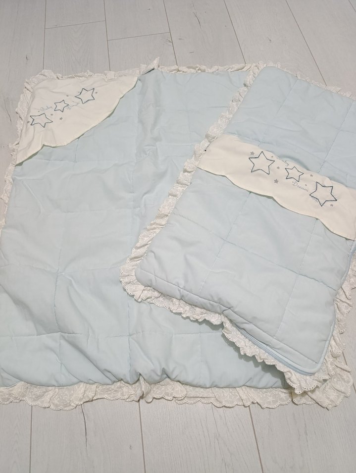 Pastel mavi keten kumaş, nakışlı yıldız desenleri ve dantel kenarlarıyla yumuşak ve rahat bir bebek uyku seti.