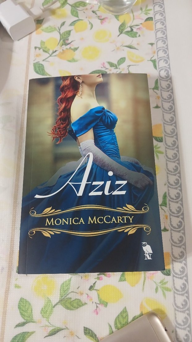 Monica McCarty'nin Aziz adlı romanı, mavi elbiseli bir kadın kapak görseliyle tarihi ya da romantik bir temaya işaret ediyor.