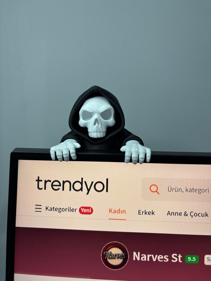 Kollarını monitör kalınlığına göre ayarlayabilirsiniz . Koyu gri renkli, kapüşonlu kafatası başlı aksiyon figürü. Kenarı tutan dekoratif ve dikkat çekici tasarım.