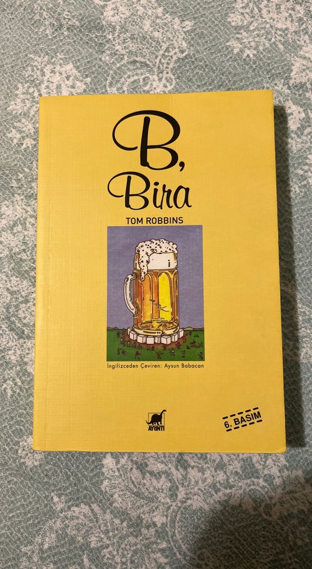Tom Robbins'in "B, Bira" kitabı, Aysun Babacan çevirisiyle, sarı kapak ve bira bardağı illüstrasyonuna sahip.