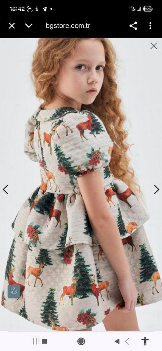 Sorunsuz sıfır Bej renkli kız çocuk elbisesi, bol kesim, kısa kollu ve yuvarlak yakalıdır. Bohem tarzda, geyik ve ağaç desenleri ile fırfır detaylara sahiptir. #yeniyil konseptine uygun #christmas #noel