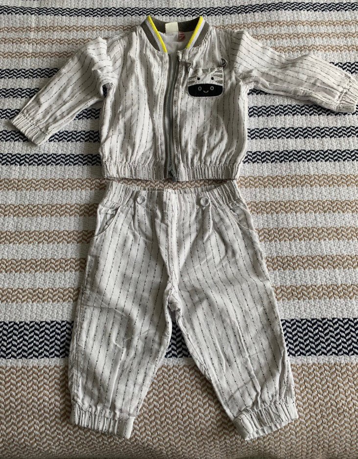 Gri renkli, uzun kollu fermuarlı ve yakalı üst ile uyumlu pantolondan oluşan bebek erkek takımı. Yumuşak keten kumaştan, rahat bir sokak tarzı sunar.
