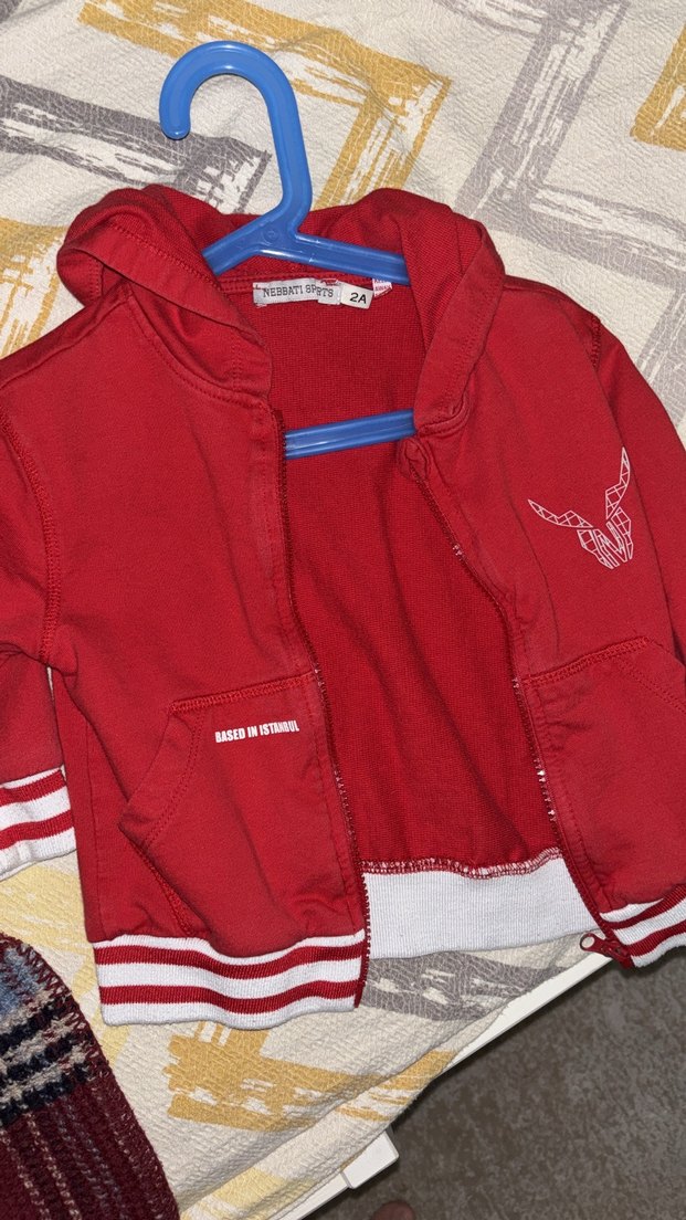 Parlak kırmızı renkte, kapüşonlu ve fermuarlı, yumuşak ve sıcak kumaştan erkek çocuk hafif solma var o yüzden uygun