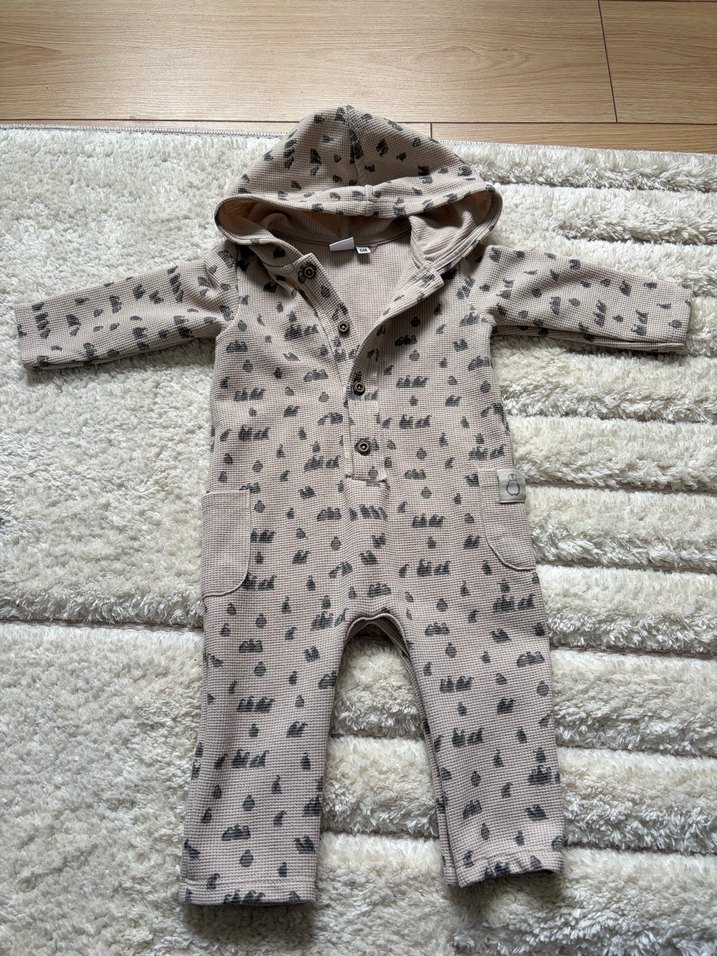 Kapüşonlu, düğmeli ve baskılı desenlere sahip gri bebek tulumu, yumuşak ve sıcak kumaştan örülüdür. Street style için uygundur. Kız erkek bebek giyebilir hiçbir Defoermesi yok