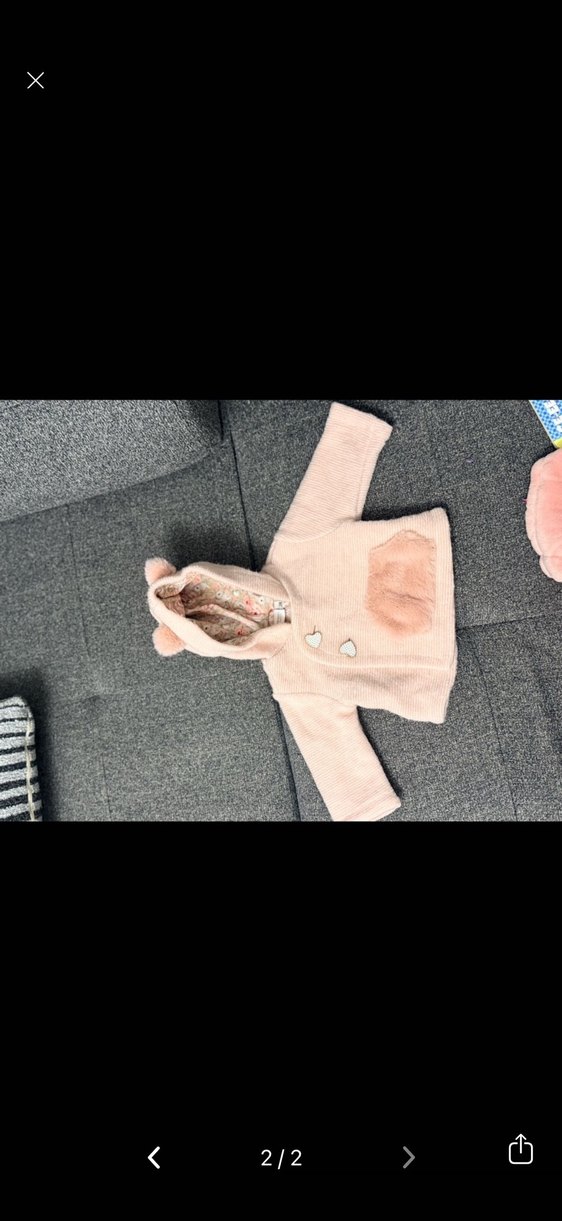 Kız çocukları için kapüşonlu, kürklü detaylı, yumuşak ve sıcak kumaştan yapılmış pastel pembe renkli, dar kesim bir ceket. Rahat sokak stili sunar. 1 kere giyildi. 3-6 ay.