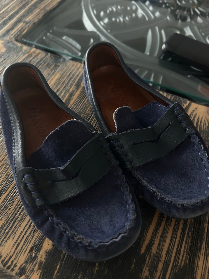 Koyu mavi renkte, süet malzemeden yapılmış, tokalı ve desen içermeyen bohem tarzda erkek çocuk özel gün ayakkabısı.