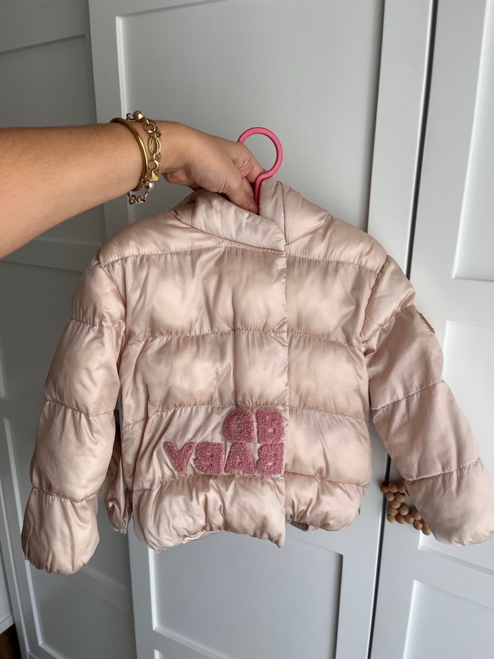 Parlak pembe, yumuşak kumaşlı kız montu. Tertemiz hiçbir kusuru yoktur