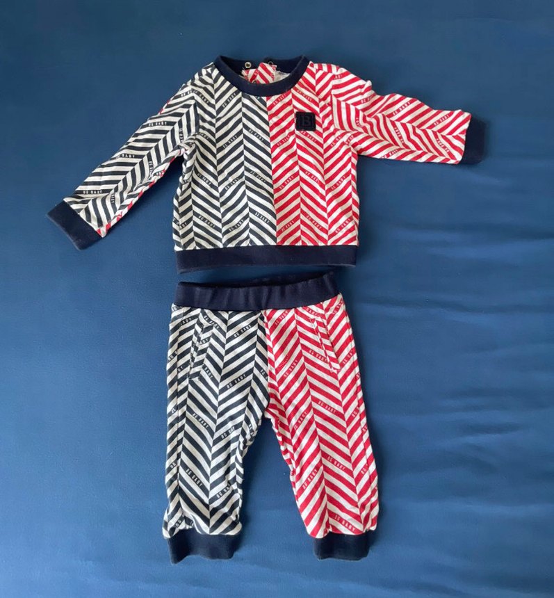 Bu bebek erkek takımında uzun kollu ve yuvarlak yaka bulunur. Yumuşak, sıcak dokulu kumaştan yapılmıştır. Koyu çok renkli tie-dye desenlidir.