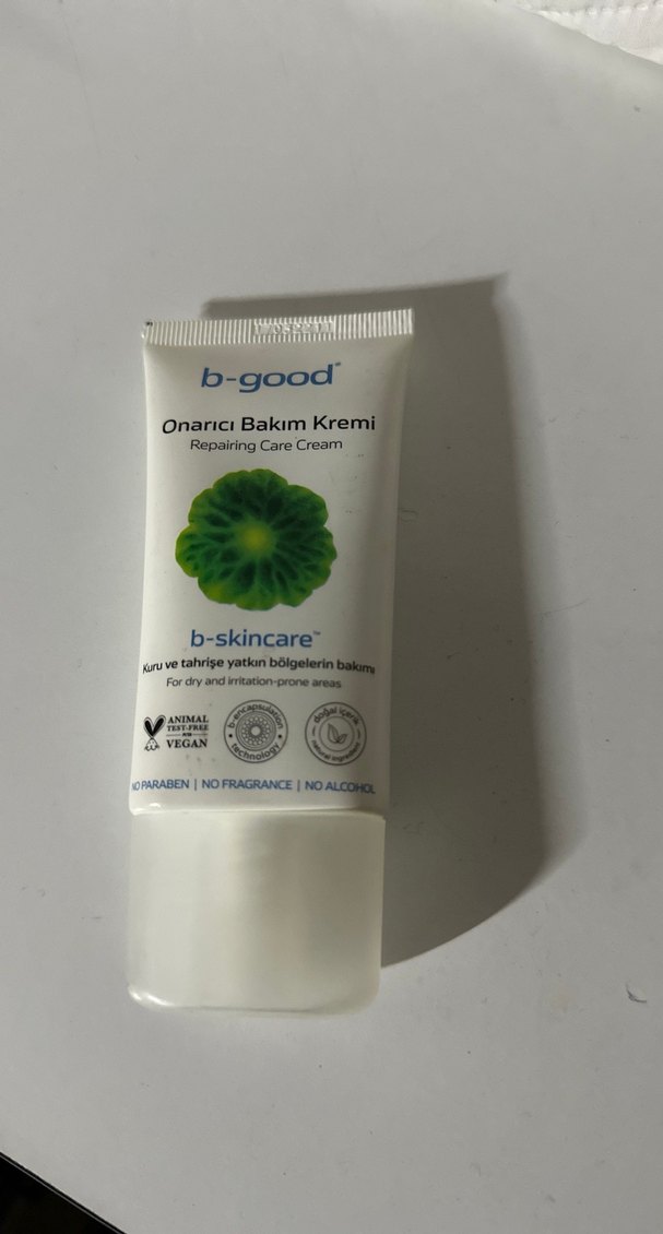 Kuru ve tahriş olmuş cilt bölgeleri için b-good Onarıcı Bakım Kremi, paraben, koku ve alkol içermez. Hassas ciltlere uygundur.