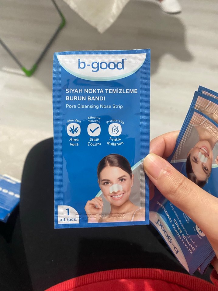 b-good burun bandı, aloe vera içerir ve siyah noktaları etkili şekilde temizler. Parlak mavi ambalajda, pratik kullanım sunar.