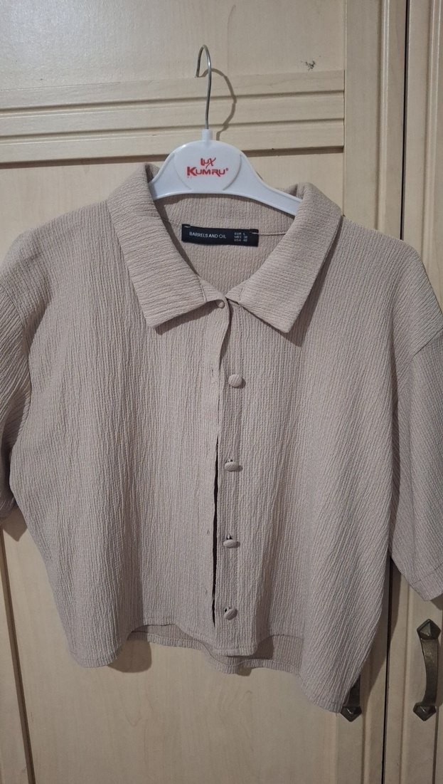 Bej keten kumaştan, düğmeli, kısa kollu ve yakalı kadın gömleği. Rahat kesimi ve kısa boyuyla günlük kullanıma uygundur.