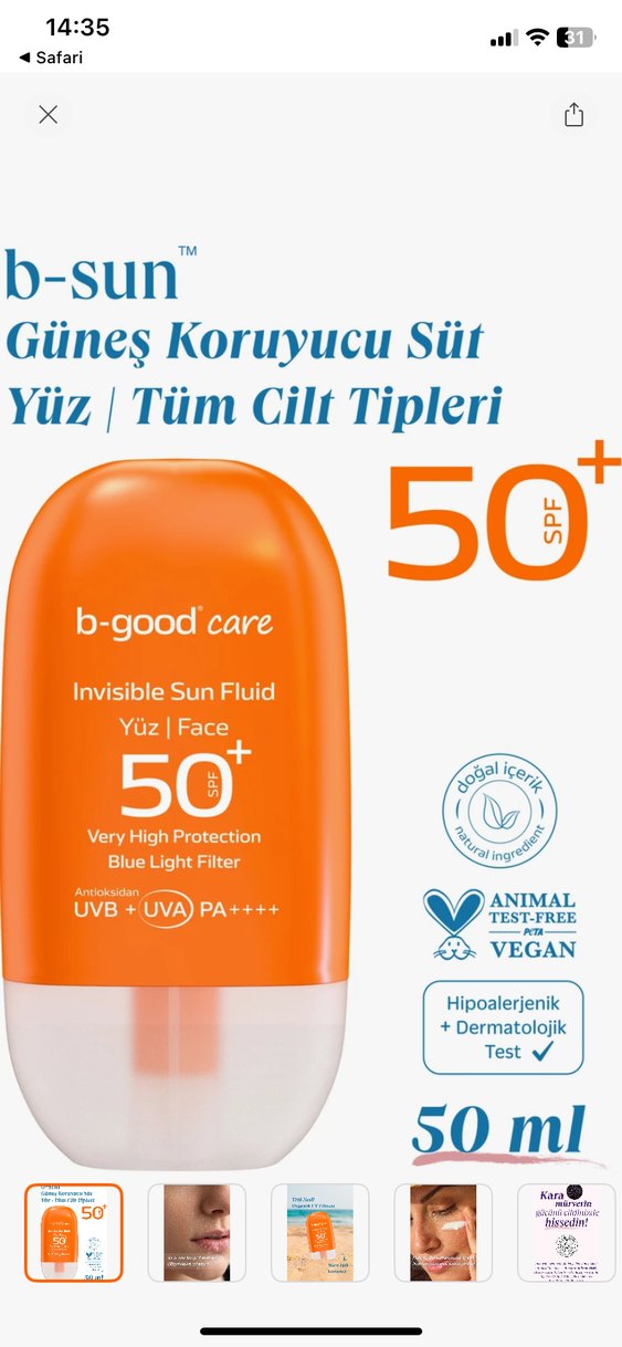 b-sun SPF 50+ görünmez güneş koruyucu süt, yüz için çok yüksek koruma sağlar. Hipoalerjenik, vegan, hayvan testi yapılmamış ve mavi ışık filtresi içerir. ☀️