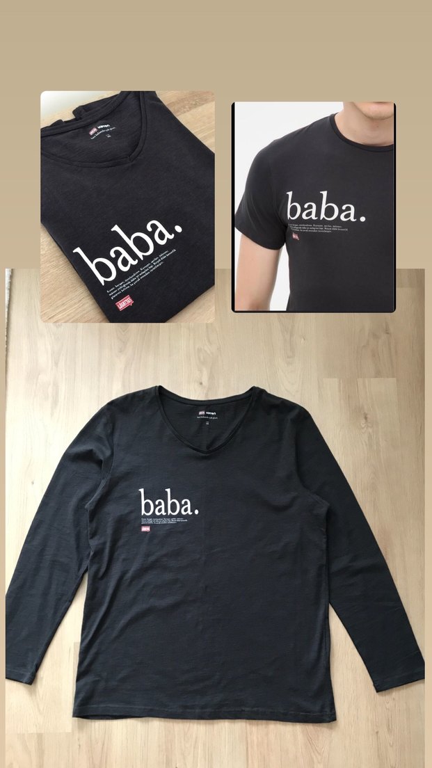 Siyah pamuklu tişört, yuvarlak yaka ve uzun kollu, bol kesimdir. Üzerinde "baba." baskısı bulunur, günlük kullanıma uygun rahat bir şıklıktadır. Sadece 1 kere kullanıldı fotoğraf çekimi için. Sıfırdan farksız. Şu an stok yok sitesinde. SON FİYAT!