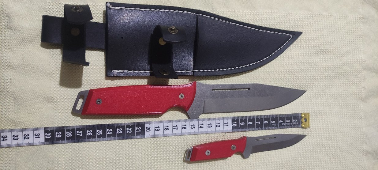 Koyu kırmızı saplı bıçak ve beyaz dikişli siyah kılıf içeren set. Bıçak yaklaşık 20 cm uzunluğundadır.