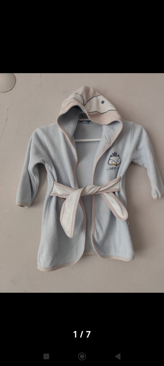 Kapüşonlu, baskılı ve kuşaklı gri erkek çocuk bornozu, yumuşak kumaştan yapılmıştır ve banyo sonrası rahatlık sağlar. Yeni. gibi. sikintisiz