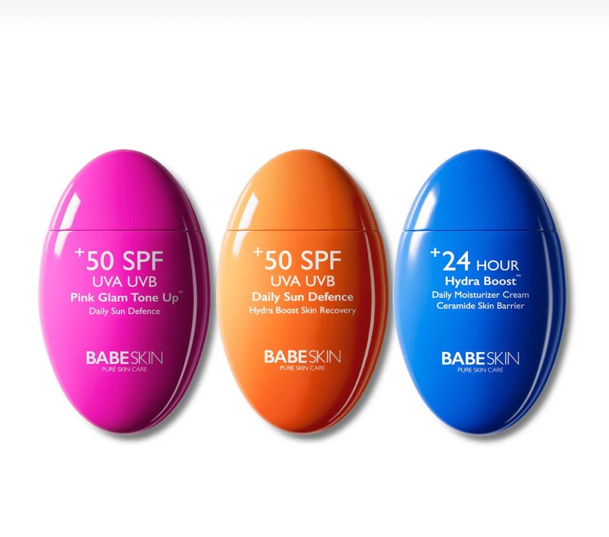BabeSkin SPF 50+ güneş koruyucu set, UVA ve UVB koruması, günlük güneş savunması, nemlendirici cilt yenilenmesi ve 24 saat nemlendirme sunar. ☀️
