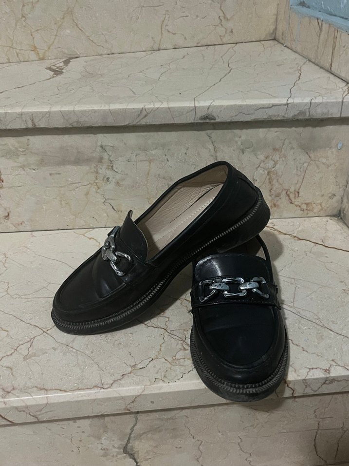 Siyah kauçuk malzemeden, blok topuklu ve tokalı, koyu yılan derisi desenli kadın loafer ayakkabı. Günlük kullanıma uygun, goth Paris tarzında şık bir model.