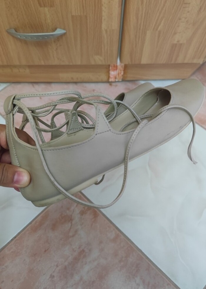 Bağcıklı balerin ayakkabısı gibi şık bir babet rengi bej. Hiç bir sorunu yok 3 4kez giymisimdir yıllardır dolapta duruyordu öyle.