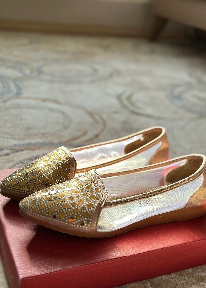 Kadın yazlık babet ayakkabı yanları transparan tül olup ön kısmı taşlı desenli ayakkabıdır sevgiler :)