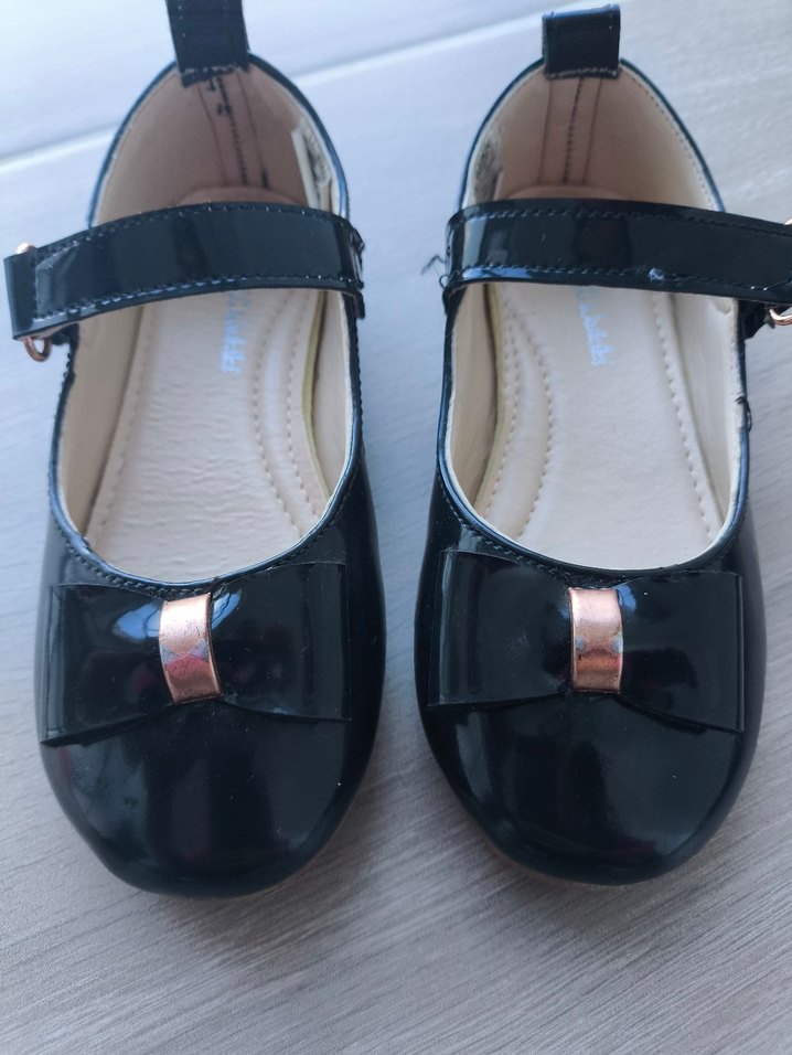 Kız çocukları için siyah rugan babetler, tokalı bant ve parlak fiyonk detayına sahiptir. resimde gördüğünüz gibidir