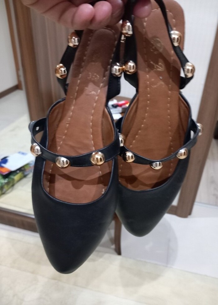 Zımba detaylı şık babet terlik olarak kullana bileceginiz Ürün birkaç saat kullanıldı yeniden farksız hiçbir deformasyonu yoktur 37 numara uyumlu olur dar kalıp.