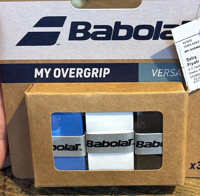 orjinal Babolat My Overgrip tenis raketi için mavi, beyaz ve siyah renklerde üçlü tutuş bandı seti. Konfor ve tutuşu artırır. sıfır ürün.