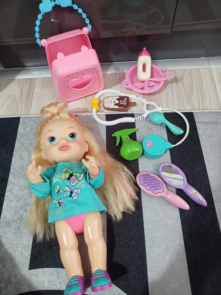Uzun sarı saçlı pastel pembe bebek, pembe çanta, saç fırçaları, oyuncak stetoskop, biberon ve bakım aksesuarları ile birlikte gelir. HEPSİ