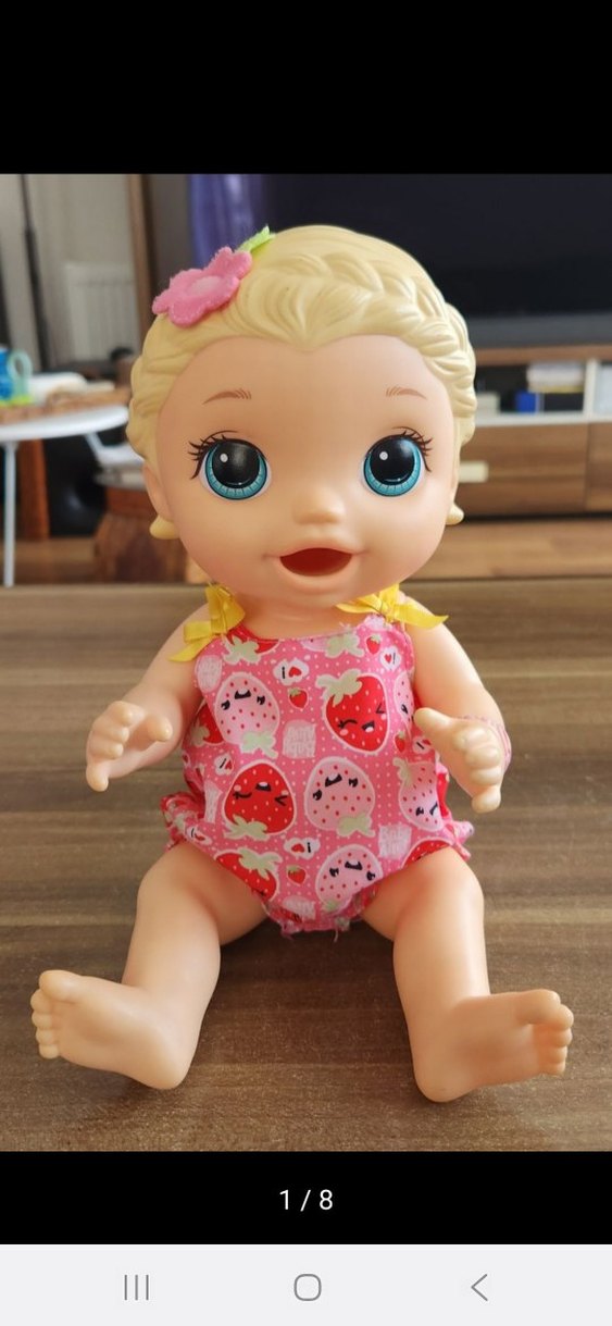 Sarı saçlı, büyük mavi gözlü renkli bebek, üzerinde çilek desenli pembe kıyafetle. Canlı ve eğlenceli oyuncak bebek. Baby alive kıyafetli oyuncak, bebek mama eşyaları yoktur fakat 4 parça kıyafeti vardır. Kıyafetlerini ananemiz ördü, 3 parçası örmedir. Yeniden farkı yoktur, Tertemiz. #dıy #kendinyap #örgü #bebek #mama #kıyafet #babyalive