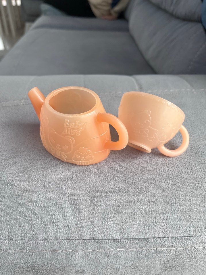 Pastel bej renkli, kabartmalı ayı desenli mini çaydanlık ve fincan seti, dekoratif kullanım için uygundur.