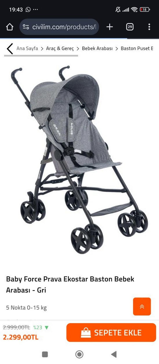 Baby Force Prava Ekostar gri kumaşlı, tente özellikli, hafif ve katlanabilir baston bebek arabasıdır. Emniyet kemerleri ve kolay hareket eden tekerlekleri vardır.