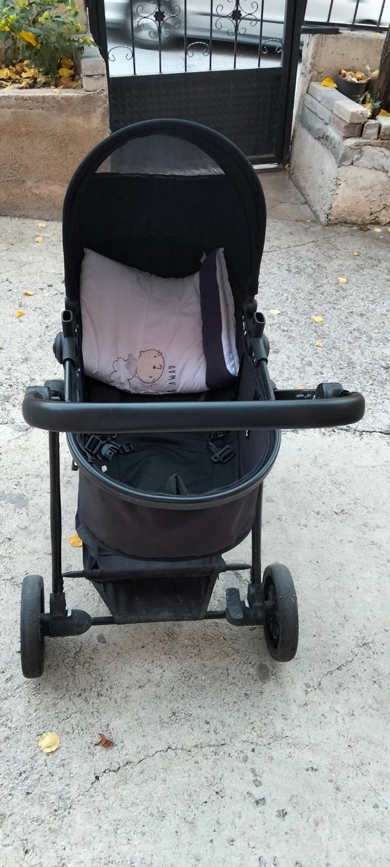 Oturma alanına sahip siyah bebek arabası. Dayanıklı çerçeve ve kolay manevra için dört tekerlekli. alt tarafında ufak bir yırtık vardır başka hiçbir sorunu yoktur.