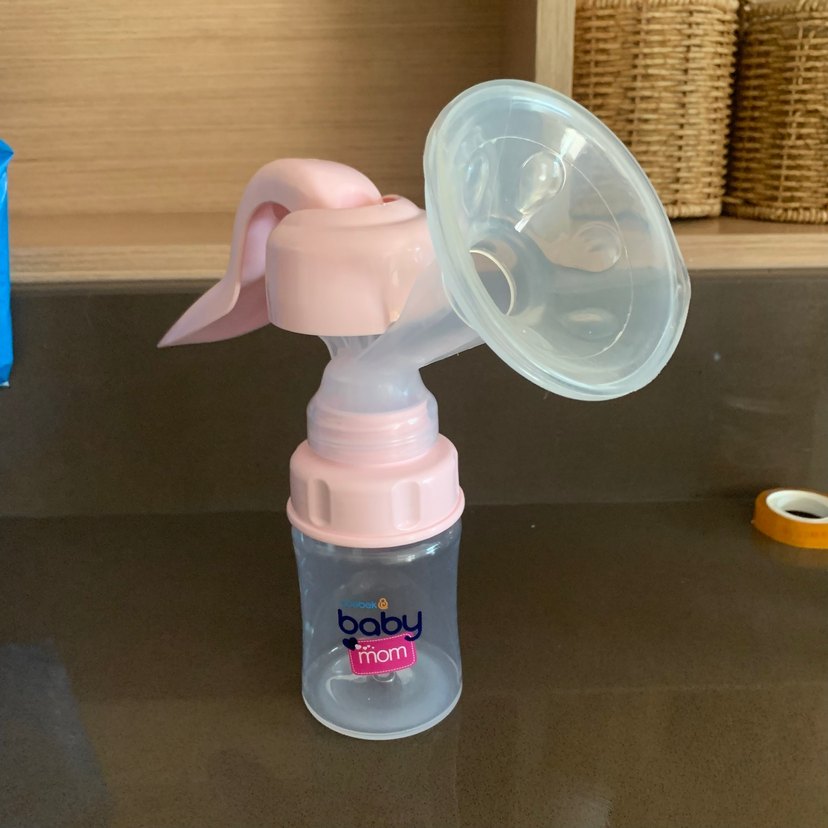Pastel pembe renkte, yumuşak şeffaf emzik kısmı ve "baby mom" yazılı şişesi olan manuel göğüs pompası. Rahat ve etkili süt sağımı sağlar.