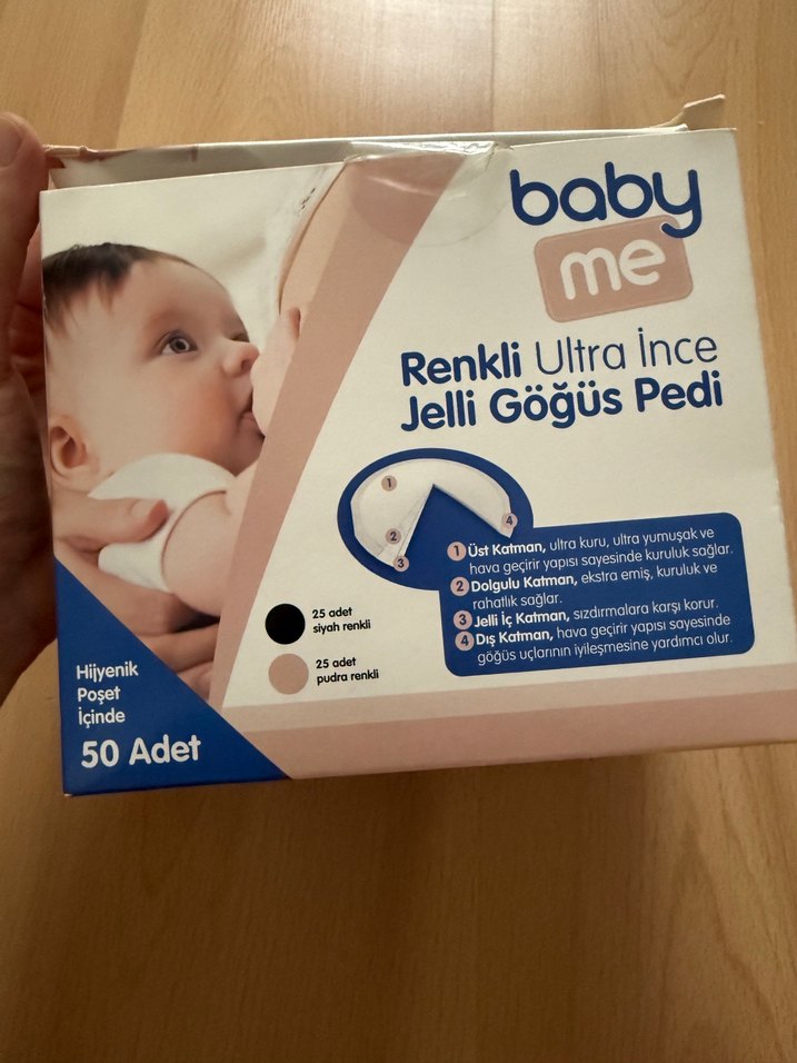 Baby Me renkli ultra ince jelli göğüs pedleri, hijyenik poşet içinde 50 adet. Yumuşak, kuru üst katman, ekstra emici dolgu katmanı ve hava geçirgen alt katman içerir. #göğüspedi #babyme