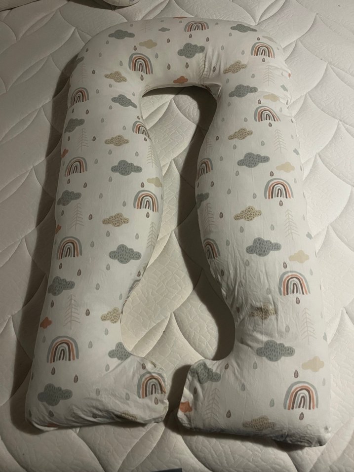 Hamilelik ve emzirme sırasında konforlu destek sağlayan, pastel renklerde gökkuşağı ve bulut desenli yumuşak hamile ve emzirme yastığı. Temiz kullanıldı. Bir yerinde ufak bi yırtık var kullanıma engel değil