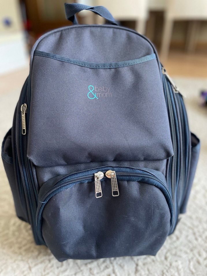 Mavi ve gri baskılı, çok bölmeli fermuarlı bebek çantasıdır. Kolay taşımak için sağlam sapı vardır. Kullanılmıştır. Önünde çizikler var ama cok kullanışlı içi tertemiz çantadır. Görsellerde inceleyiniz