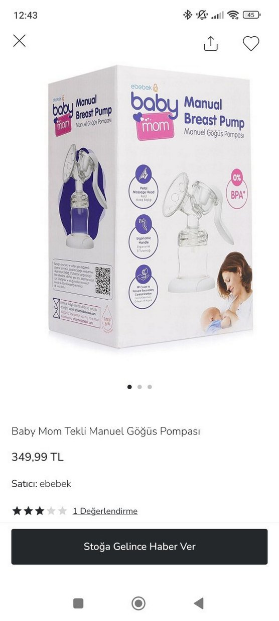 Baby Mom tekli manuel göğüs pompası, yumuşak masaj pedli ve ergonomik saplıdır. BPA içermez, rahat kullanım sağlar. Hediye geldi bende elektrikli olduğu için hiç kullanılmadı. paketi bile açılmadı.