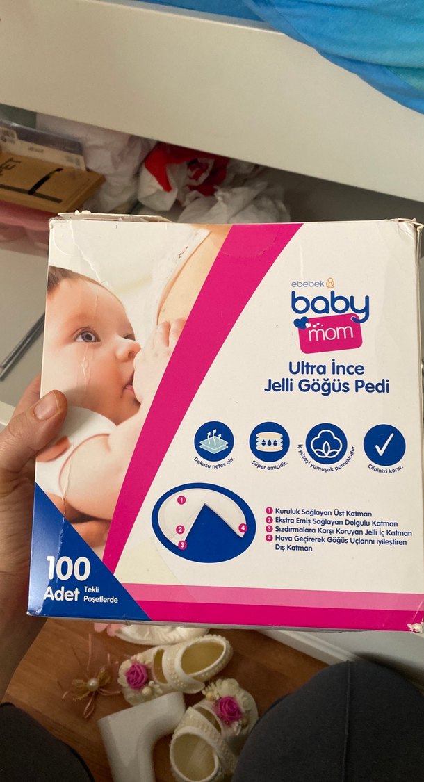 Baby Mom Ultra İnce Jelli Göğüs Pedi, 100 adet içeren pastel pembe kutuda. Yumuşak üst katman, emici dolgu ve güvenli oturuş sağlar. Hiç açılmadı elimde 2 kutu var ikisi 650 olur