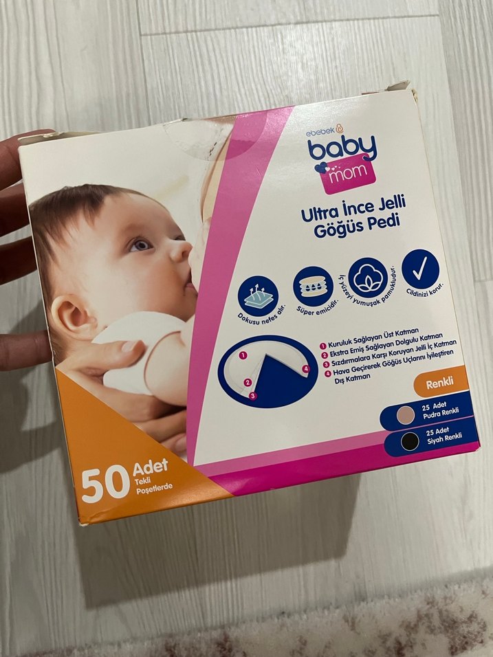 Baby Mom ultra ince jelli göğüs pedleri pastel bej renginde, 50 adetlik pakette. Süper emici, nefes alabilen ve hassas ciltler için uygundur.