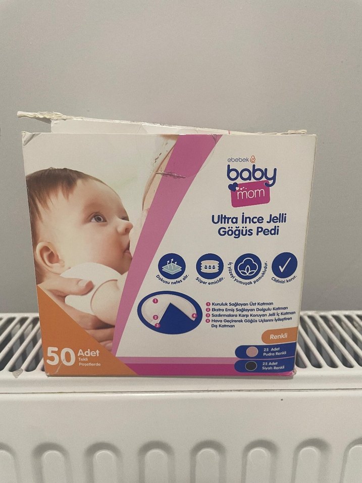 Baby Mom markalı, ultra ince jelli, sızıntıyı önleyen, 30 adet var. Pembe ve siyah renkli göğüs pedi.