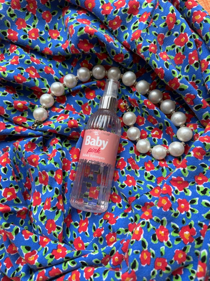 Baby Pink kadın parfümü, pembe etiketli şeffaf sprey şişede, renkli çiçekli kumaş ve inci kolye üzerinde yer alıyor.
