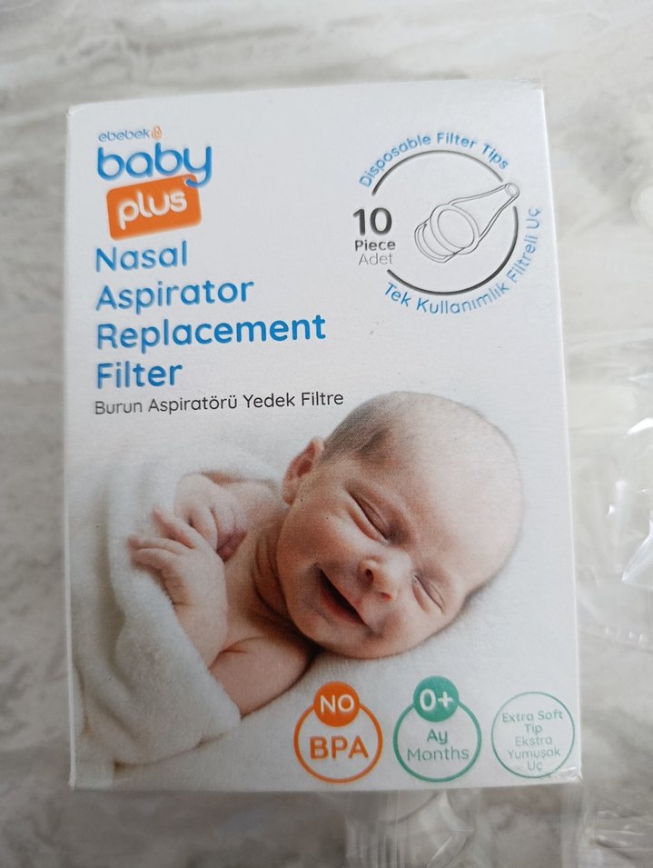 Baby Plus burun aspiratörü için 10 adet tek kullanımlık yedek filtre. BPA içermez, 0+ ay bebekler için uygundur. Yumuşak uçludur. içinde 11 tane vardır hepsi paketlidir hiç kullanılmamış üründür paketini fotoğraf çekmek için açtım aspiratör yoktur sadece yedek filtreler var sonraki aspiratör kutusunu uyumlu olduğu aspiratörü göstermek için yükledim. e bebek ürünü
