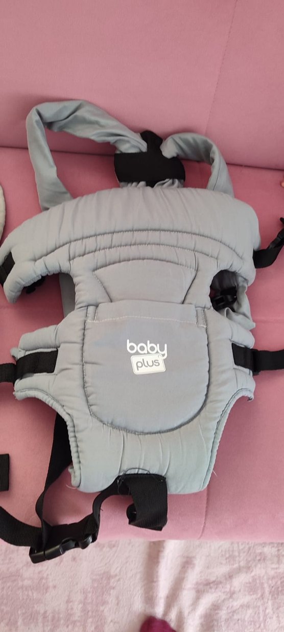 Baby Plus gri bebek taşıyıcı, rahat ve güvenli taşıma için dolgulu askılar ve ayarlanabilir bağlamalar içerir.