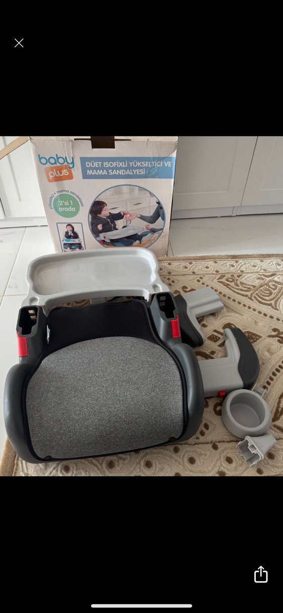 Baby Plus gri çocuk araba koltuğu, ISOFIX bağlantılı ve mama sandalyesi olarak kullanılır. Tepsi ve bardaklık içerir. ️