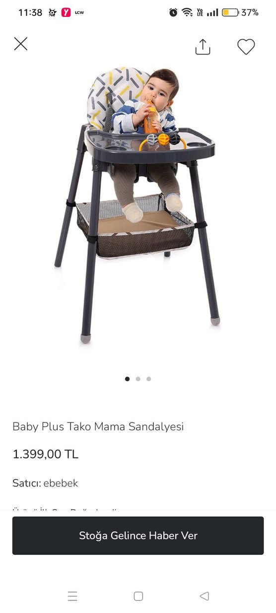 Baby Plus Tako mama sandalyesi, gri ve siyah renklerde, geniş tepsi ve alt kısımda saklama sepeti yoktur sağlam ve kullanışlıdır.